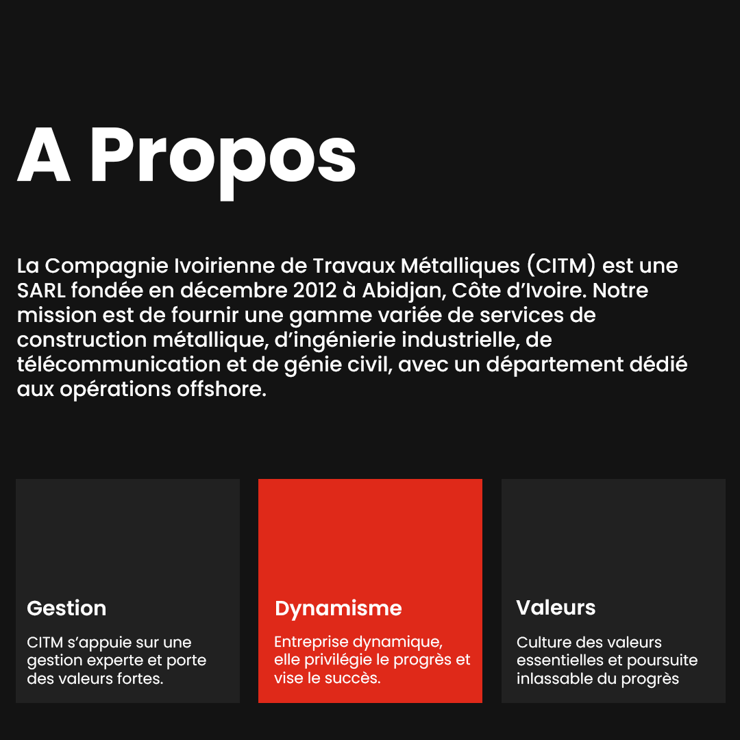 CITM propose des services intégrés principalement dans le secteur du pétrole et gaz, avec une diversification vers l’industrie de production, télécom et génie civil.